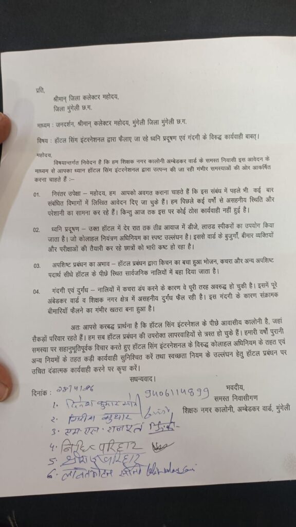 मुंगेली। जिला मुख्यालय के शिक्षक नगर कॉलोनी (अम्बेडकर वार्ड) के निवासियों ने होटल सिंग इंटरनेशनल द्वारा फैलाए जा रहे ध्वनि प्रदूषण और गंदगी के खिलाफ मोर्चा खोल दिया है। क्षेत्रवासियों ने जिला कलेक्टर को शिकायती पत्र सौंपकर होटल प्रबंधन के विरुद्ध कड़ी कार्रवाई की मांग की है।