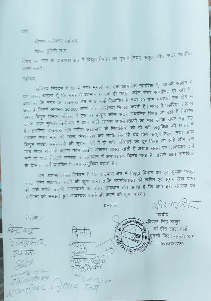 मुगेली/शहर के दाऊपारा क्षेत्र में गहराते बिजली संकट और शिकायतों के निराकरण में हो रही देरी को देखते हुए स्थानीय नागरिकों ने अब आर-पार की लड़ाई का मन बना लिया है। क्षेत्र के जागरूक नागरिक रविराज सिंह ठाकुर के नेतृत्व में कलेक्टर कुंदन कुमार को ज्ञापन सौंपकर दाऊपारा में बिजली विभाग का नया पृथक फ्यूज कॉल सेंटर खोलने की मांग की गई है।