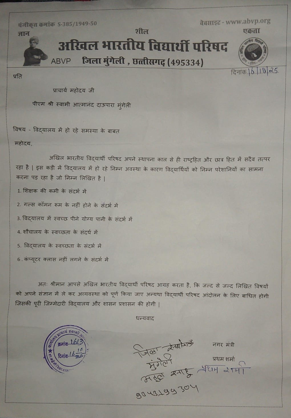 मुंगेली ✍️अखिल भारतीय विद्यार्थी परिषद (ABVP) मुंगेली नगर इकाई द्वारा पी.एम. श्री स्वामी आत्मानंद विद्यालय, दाऊपारा (मुंगेली) में विद्यार्थियों को मिल रही सुविधाओं की कमी और विद्यालय में व्याप्त अव्यवस्थाओं को लेकर विद्यालय प्राचार्य महोदय को ज्ञापन सौंपा गया।