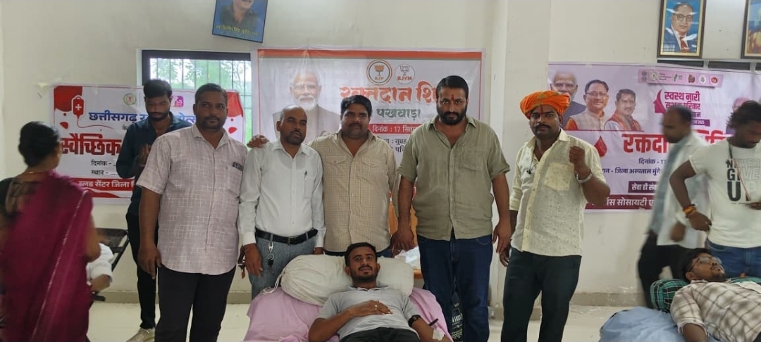 मुंगेली। प्रधानमंत्री नरेंद्र मोदी के 75वें जन्मदिवस पर भारतीय जनता पार्टी एवं युवा मोर्चा के नेतृत्व में जिला भाजपा कार्यालय अटल परिसर तथा सरदार वल्लभभाई पटेल सभा भवन में रक्तदान शिविर का आयोजन किया गया। शिविर में जिले के 80 लोगों ने रक्तदान कर मानव सेवा का संदेश दिया।शिविर की शुरुआत अतिथियों ने भारत माता, पंडित दीनदयाल उपाध्याय एवं डॉ. श्यामा प्रसाद मुखर्जी के चित्र पर दीप प्रज्वलित और पुष्पांजलि अर्पित कर की। इस दौरान भाजपा जिलाध्यक्ष दीनानाथ केशरवानी ने विधायक पुन्नूलाल मोहले, गिरीश शुक्ला, सुनील पाठक, संजय वर्मा और मिट्ठूलाल यादव की मौजूदगी में स्वयं रक्तदान कर युवाओं को प्रेरित किया। महिला मोर्चा की नेत्री श्वेता सोनी ने भी रक्तदान कर सक्रिय सहभागिता निभाई।शिविर में लोरमी विधायक अरुण साव के प्रतिनिधि विक्रम सिंह सहित रामशरण यादव, करण सिंह, आसिफ खोखर, पथरिया मंडल अध्यक्ष सोमेश राजपूत, पवन मिश्रा, उमाशंकर बघेल व अन्य कार्यकर्ता शामिल हुए। आयोजनों से प्रेरित होकर 80 लोगों ने रक्तदान किया।इस अवसर पर कलेक्टर कुंदन कुमार, पुलिस अधीक्षक भोजराम पटेल और जिला पंचायत सीईओ प्रभाकर पांडे ने उपस्थित रहकर रक्तदाताओं का उत्साहवर्धन किया।