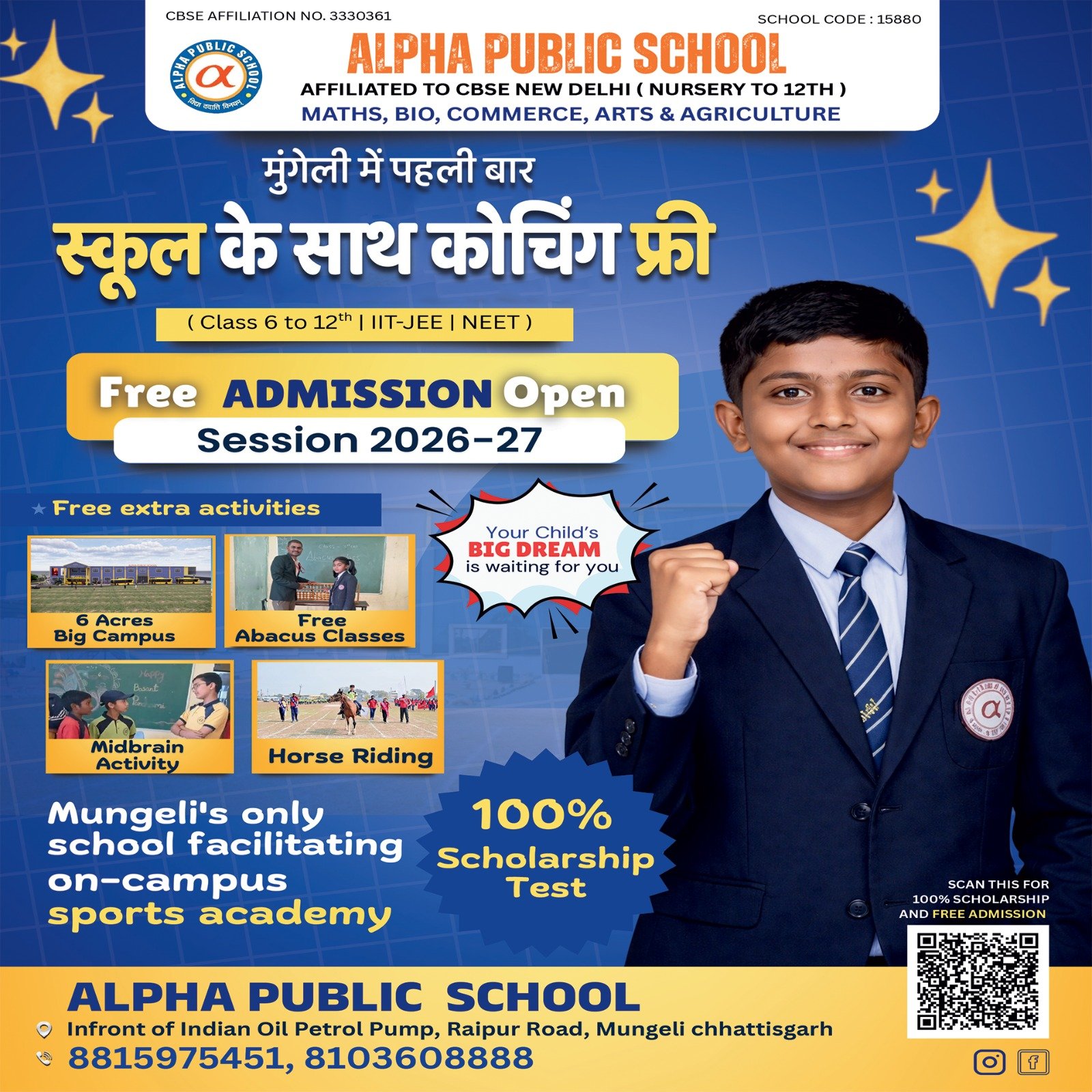 अक्सर देखा जाता है कि बच्चे स्कूल के बाद भारी-भरकम फीस देकर बाहर कोचिंग जाते हैं, जिससे उनका समय और पैसा दोनों बर्बाद होता है। इसी समस्या का समाधान करते हुए अल्फा पब्लिक स्कूल (CBSE Affiliated) ने घोषणा की है कि कक्षा 6वीं से 12वीं तक के छात्रों को स्कूल के बाद शाम को शहर की सबसे अच्छी कोचिंग संस्थान में NEET, JEE और कॉमर्स जैसे विषयों की निशुल्क कोचिंग दी जाएगी। यह पूरी सुविधा AC क्लासरूम में उपलब्ध होगी।