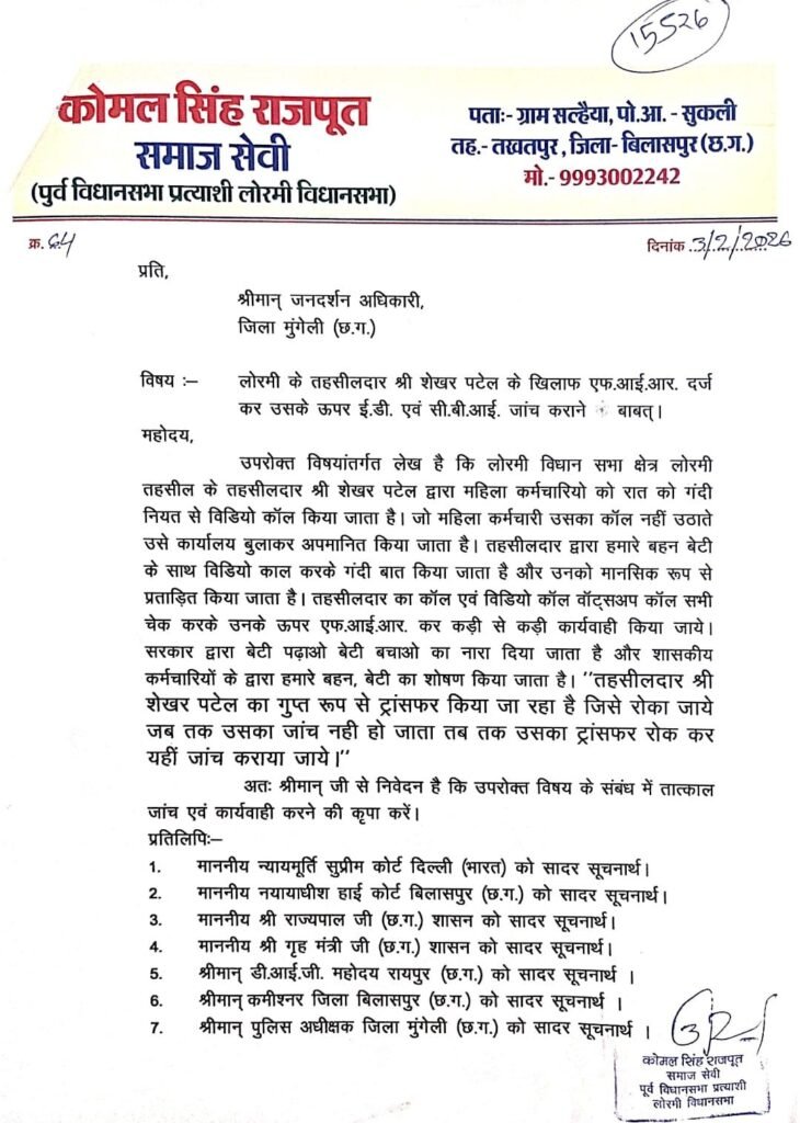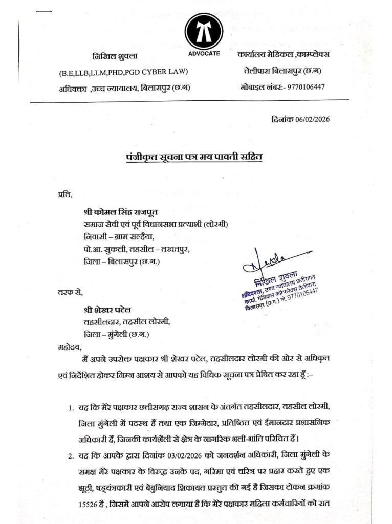 लोरमी। राजनीति के हॉटस्पॉट लोरमी विधानसभा में एक ईमानदार छवि के अधिकारी को बदनाम करने की साजिश अब साजिशकर्ताओं पर ही उलटी पड़ती दिखाई दे रही है। क्षेत्र के तथाकथित समाज सेवक कोमल सिंह राजपूत द्वारा सोशल मीडिया के माध्यम से तहसीलदार शेखर पटेल के विरुद्ध किए गए भ्रामक दुष्प्रचार और चरित्र हनन की कोशिशों के खिलाफ अब कानूनी मोर्चा खोल दिया गया है। तहसीलदार पटेल ने अपनी सामाजिक और प्रशासनिक प्रतिष्ठा को ठेस पहुँचाने वालों को हाईकोर्ट के अधिवक्ता के माध्यम से मानहानि का विधिक नोटिस थमाया है।