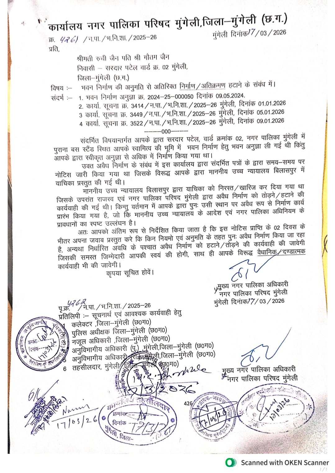 इस नोटिस की प्रतिलिपि कलेक्टर मुंगेली, पुलिस अधीक्षक, और तहसीलदार सहित संबंधित विभागों को आवश्यक कार्रवाई हेतु भेजी गई है।
