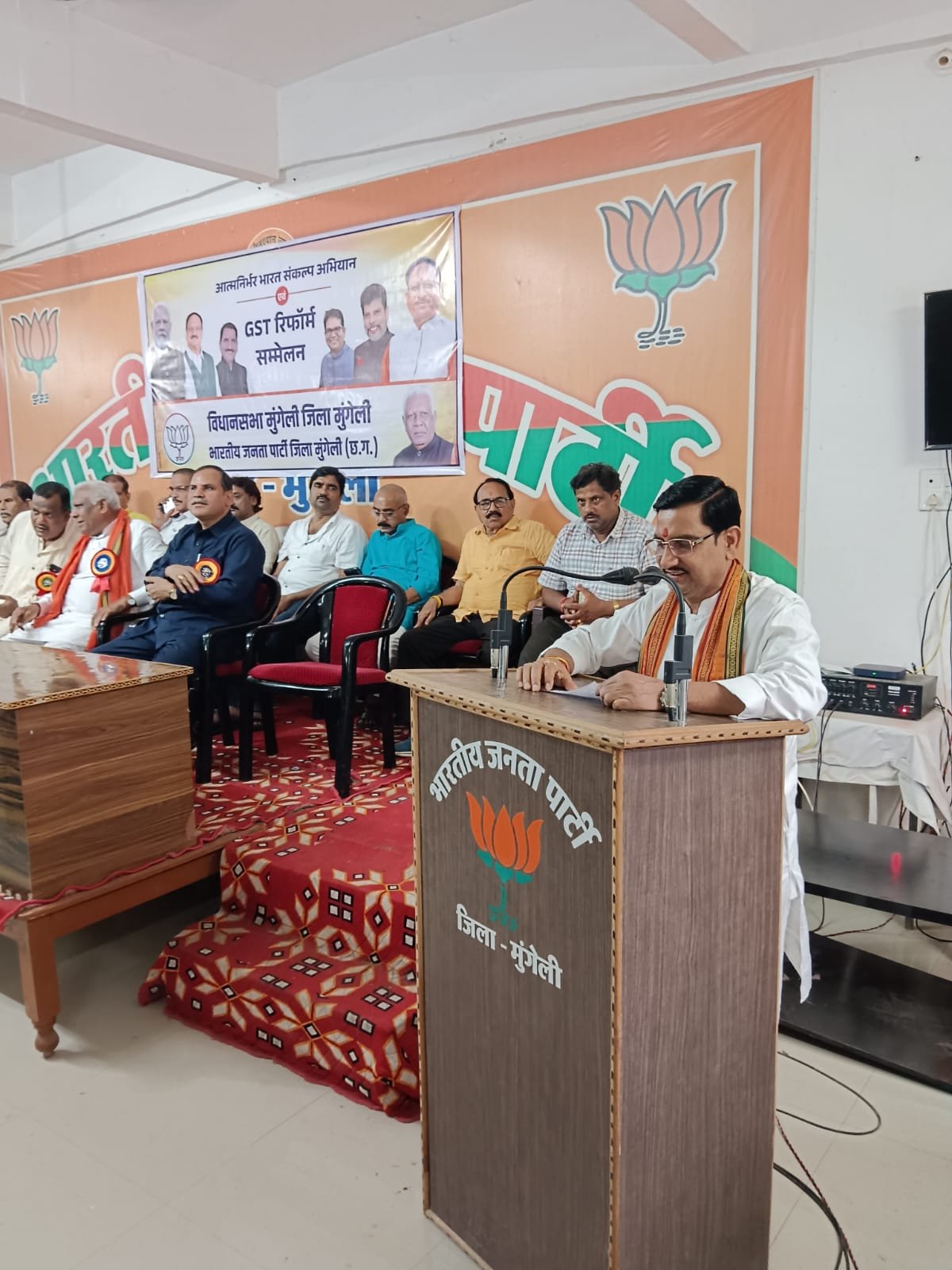 मुंगेली। भारतीय जनता पार्टी द्वारा मुंगेली विधानसभा स्तरीय कार्यशाला का आयोजन आत्मनिर्भर भारत एवं जीएसटी रिफॉर्म विषय पर किया गया। कार्यक्रम के मुख्य वक्ता केंद्रीय राज्यमंत्री एवं बिलासपुर लोकसभा सांसद तोखन साहू रहे, जबकि विधायक पुन्नूलाल मोहले और पूर्व सांसद लखनलाल साहू ने वक्ता के रूप में भाग लिया।कार्यशाला की शुरुआत स्वागत भाषण और विषय परिचय से हुई, जिसे भाजपा जिलाध्यक्ष दीनानाथ केशरवानी ने प्रस्तुत किया। मुख्य वक्ता तोखन साहू ने कहा कि प्रधानमंत्री नरेंद्र मोदी का लक्ष्य वर्ष 2047 तक भारत को विकसित राष्ट्र बनाना है, जिसके लिए आत्मनिर्भर भारत अभियान की भावना सभी नागरिकों में विकसित करना आवश्यक है।