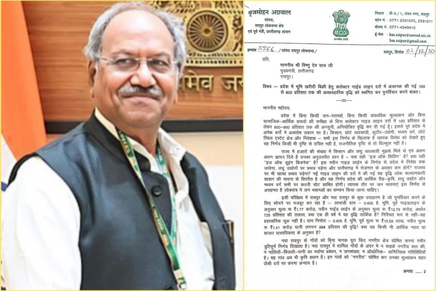 रायपुर। प्रदेश में भूमि खरीदी-बिक्री के लिए कलेक्टर गाइड लाइन दरों में की गई 100 से 800 प्रतिशत तक की वृद्धि का मामला अब राजनीतिक रूप से गर्मा गया है। रायपुर लोकसभा क्षेत्र के सांसद एवं पूर्व मंत्री बृजमोहन अग्रवाल ने मुख्यमंत्री विष्णुदेव साय को पत्र लिखकर इस निर्णय को अव्यावहारिक बताते हुए तत्काल स्थगित करने की मांग की है।
