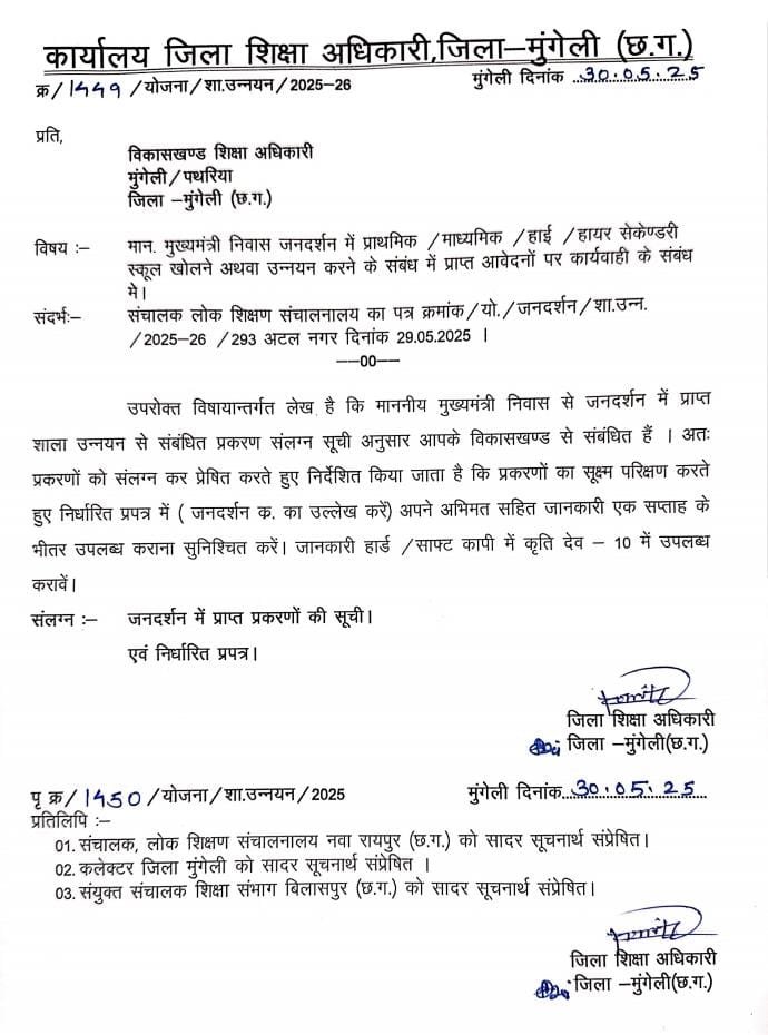 इस आशय का आदेश जिला शिक्षा अधिकारी बिलासपुर एवं मुंगेली के द्वारा विकासखंड शिक्षा अधिकारी को जारी किया है।