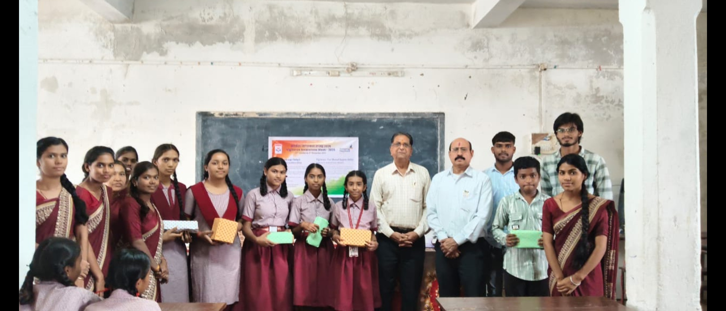 कार्यक्रम की अध्यक्षता कर रहे रवि पौराणिक जी ने कहा हमारे पूरे जीवन काल में सतर्कता का बड़ा महत्व है हम कितने अच्छे तरीके से अपने सारे कामों को व्यवस्थित ढंग से पूरा करते हैं यही हमारी सफलता का सूत्रधार बनता है सावधानी हमारा अभिन्न अंग है निबंध प्रतियोगिता में प्रथम पुरस्कार निवी देवांगन द्वितीय पुरस्कार मुस्कान देवांगन एवं तृतीय पुरस्कार रीमा बर्मन को प्राप्त हुआ सांत्वना पुरस्कार नैना देवांगन वैशाली साहू और दीपेश देवांगन को प्राप्त हुआ कार्यक्रम में40 विद्यार्थी भाग लिए थे रवि गैस एजेंसी की तरफ से पुरस्कार दिया गया