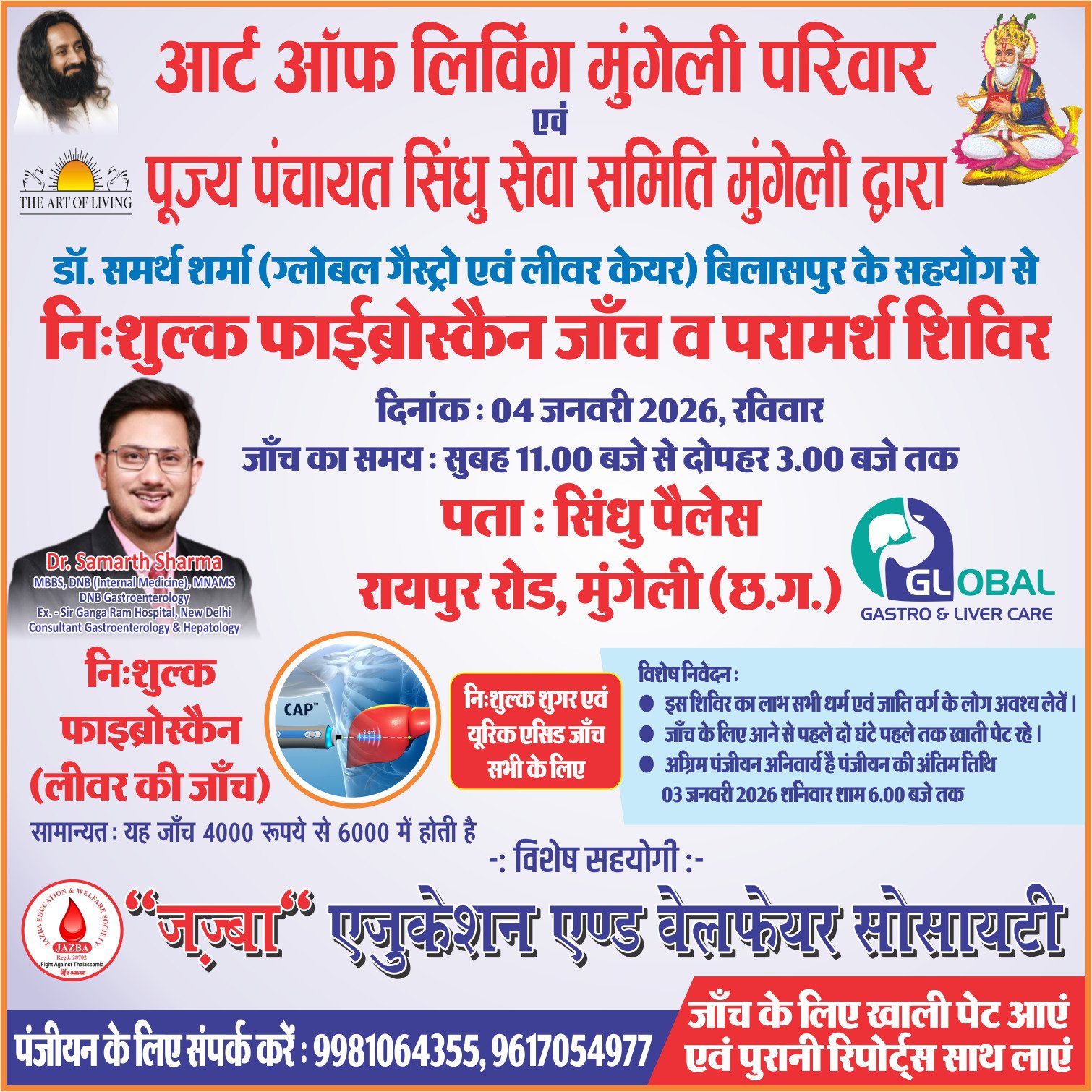 मुंगेली। शहर के नागरिकों के लिए राहत भरी खबर है। आर्ट ऑफ लिविंग मुंगेली परिवार और पूज्य पंचायत सिंधु सेवा समिति द्वारा एक विशाल निःशुल्क फाइब्रोस्कैन जांच एवं परामर्श शिविर का आयोजन किया जा रहा है। यह शिविर आगामी 04 जनवरी 2026, रविवार को रायपुर रोड स्थित सिंधु पैलेस में आयोजित होगा।