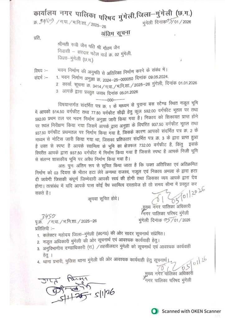 अवैध निर्माण पर”मुंगेली नगरपालिका का अंतिम अल्टीमेटम: 3 दिन में हटा लें अवैध निर्माण, वरना चलेगा प्रशासन का बुलडोजर”