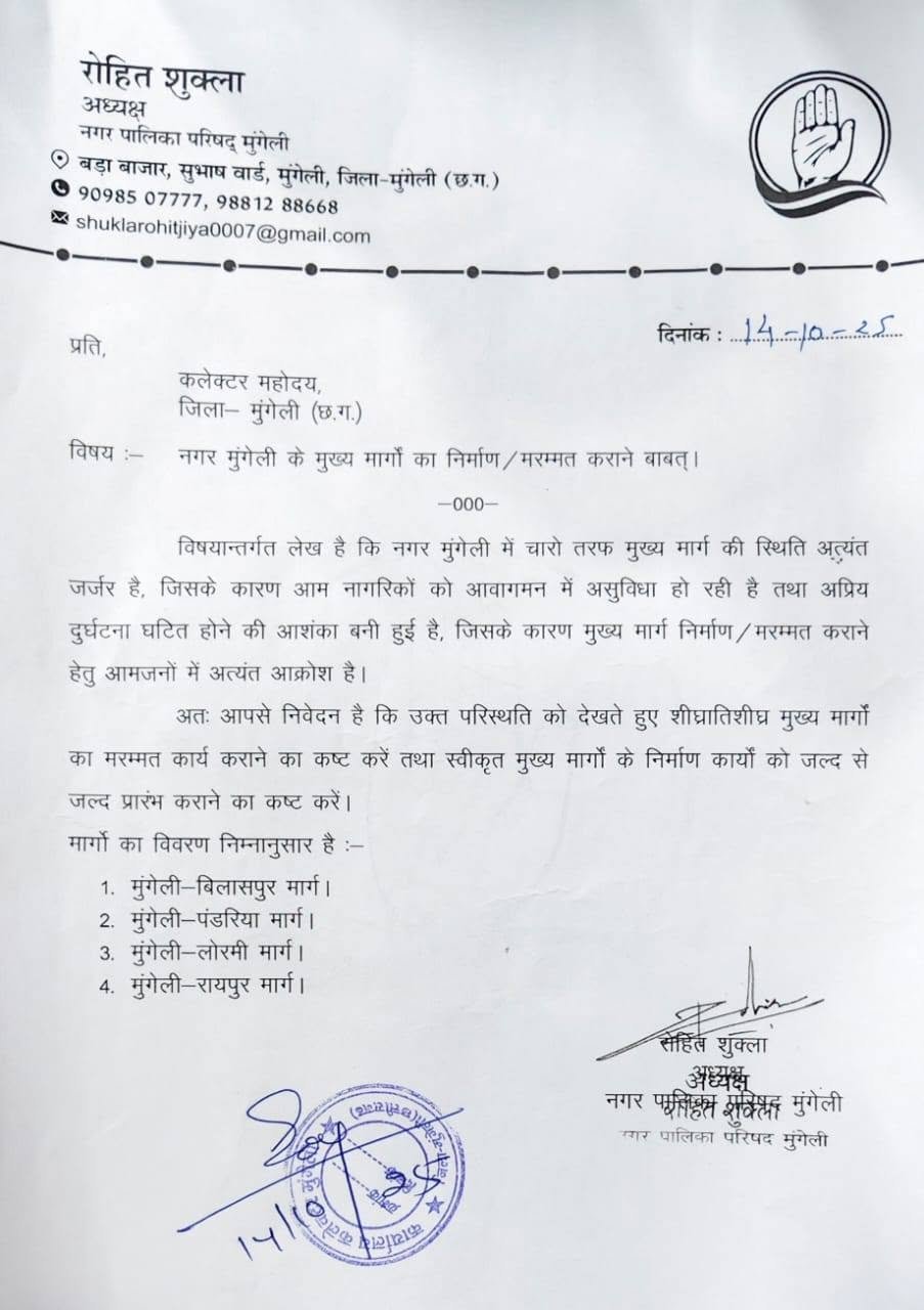 खराब सड़कें किसी भी समय अप्रिय दुर्घटना का कारण बन सकती हैं, जिससे आमजनों का आक्रोश बढ़ता जा रहा है।अध्यक्ष ने अपने पत्र में अनुरोध किया कि इन परिस्थतियों को देखते हुए मुख्य मार्गों का निर्माण और मरम्मत कार्य जल्द शुरू किया जाए। उन्होंने यह भी कहा कि जिन मार्गों का निर्माण स्वीकृत हो चुका है, उनके कार्य में तेजी लाई जाए और शीघ्र पूरा किया जाए।ज्ञापन में जिन मार्गों का विवरण दिया गया है वे इस प्रकार हैं —मुंगेली-बिलासपुर मार्गमुंगेली-पंडरिया मार्गमुंगेली-लोरमी मार्गमुंगेली-रायपुर मार्गशुक्ला ने स्पष्ट किया कि इन मार्गों की दुरुस्ती से न केवल नगरवासियों को राहत मिलेगी बल्कि जिले की यातायात व्यवस्था भी सुचारू होगी।