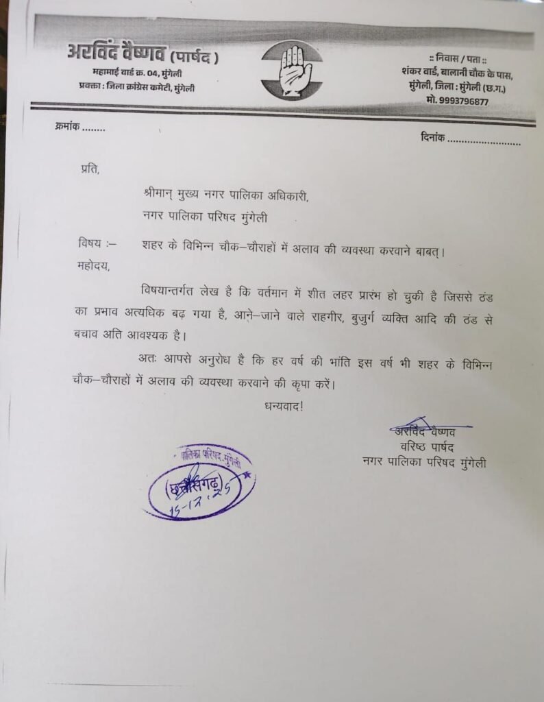 मुंगेली ✍️इन दिनों बढ़ती ठंड के मद्देनजर नगर प्रशासन द्वारा शहर के विभिन्न स्थानों पर अलाव की व्यवस्था की गई है। वरिष्ठ पार्षद अरविंद वैष्णव द्वारा ठंड से राहत हेतु दिए गए ज्ञापन के बाद नगर पालिका ने तत्काल कार्रवाई करते हुए नए बस स्टैंड, पुराने बस स्टैंड गांधी पुतला के पास, बड़े बाजार हनुमान मंदिर के समीप और दाउपारा क्षेत्र में अलाव जलवाए गए । स्थानीय नागरिकों ने इस पहल के लिए पार्षद एवं प्रशासन का आभार व्यक्त करते हुए कहा कि अलाव की व्यवस्था से आमजन को काफी राहत मिल रही है। उल्लेखनीय है कि पिछले कुछ दिनों से तापमान में तेजी से गिरावट दर्ज की जा रही है, जिसके चलते नगर के गरीब और असहाय लोगों के लिए ऐसी व्यवस्थाएं आवश्यक हो गई थीं।
