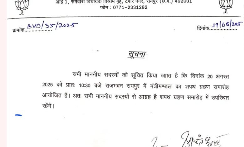 Read More »रायपुर से बड़ी खबर सामने आई है। छत्तीसगढ़ में मंत्रिमंडल विस्तार की प्रक्रिया अब तय हो गई है। भाजपा विधायक…